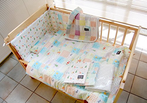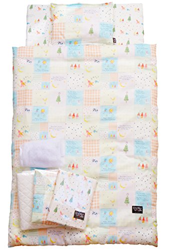 赤ちゃんに肌触りが優しいダブルガーゼの生地を使用したベビー布団10点セットです。 生地も縫製も日本製。 お洗濯の替えに困らないよう、2つの柄の掛けふとんカバーに、2つの柄のワンタッチシーツを組合わせました。 更に、キルトパッド、お洗濯ネットも付いた、とてもお得な10点セットです。 さらりとした肌触りのダブルガーゼ生地はコンパクトにまとまり、お洗濯しやすいのが特徴です。 又、ダブルガーゼ生地は速乾性に優れていますので、乾きが早くマメなお洗濯でいつも清潔にお使い頂けます。 ○サイズ: ・掛け布団カバー1/約90×120cm ・掛け布団カバー2/約90×120cm ・ワンタッチシーツ1/約71×122×6cm ・ワンタッチシーツ2/約71×122×6cm ・掛けふとん中しん(厚手)/約85×115cm ・まくらカバー/約27×37cm ・まくら中しん/約25×35cm ・固わた敷きマット/約70×120×5.5cm ・キルトパッド/約70×120cm ・洗濯ネット(円柱形)/直径約38×H約52cm ○材質: ・カバー・シーツ・まくら側地・掛けふとんカバー側地/綿100% ・まくら中しん・掛けふとん中しん/ポリエステル100%(ウォッシャブルわた) ・キルトパッド/ポリエステル100% ・固わた敷きマット/ポリエステル100%