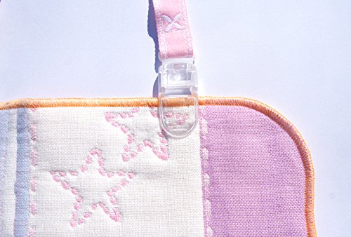 - [素材 ]綿100% 6重 ガーゼ クリップベルトはピンク。縁取りの色はオレンジ、ブルー、グリーンの3色です。