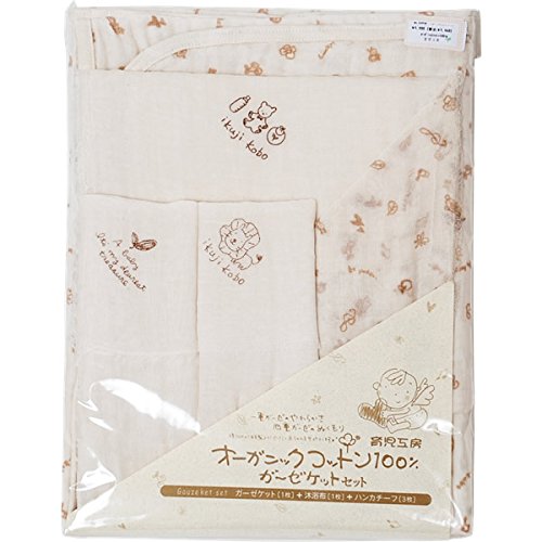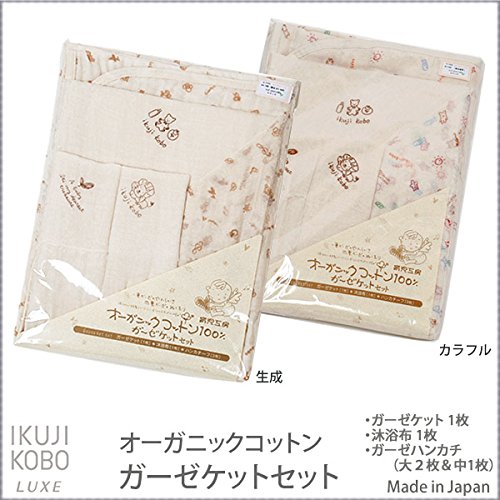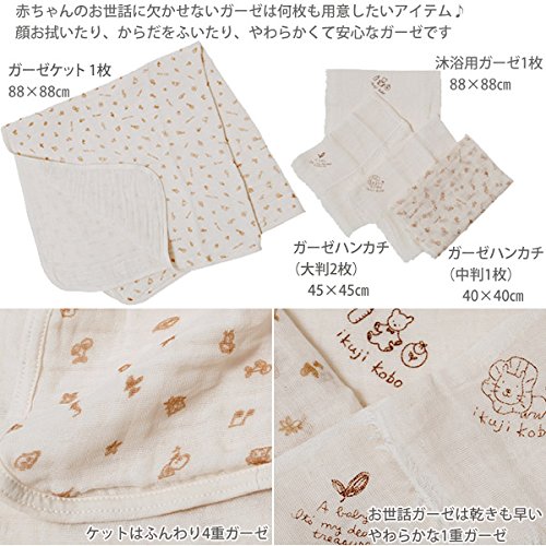 育児工房のオーガニックコットンガーゼケットセットです。 ガーゼケット1枚、沐浴用ガーゼ1枚、ガーゼハンカチ3枚(大判2枚 中判1枚)が入ったお得なセットです。 ※ハンカチの柄はおまかせとなります。 4重ガーゼのガーゼケットは湯上りやおくるみ、肌掛けなど用途もたくさん。 沐浴布は大き目サイズの1重ガーゼで、赤ちゃんの体にとってもなじみやすいです。 ガーゼハンカチは赤ちゃんのケアに欠かせないアイテム。 お口拭きやお顔拭きはもちろん、2重に折って背中の汗取り、三角に折って後ろで結べばスタイとしても使えます。 用途に合わせて折り方を変えてお使い頂けます。 赤ちゃんのやわらかいお肌も、やさしいガーゼなら安心ですね。 育児工房の製品は綿花を糸につむぐところから縫製まですべて日本国内で行なっています。 愛知県知多半島で生産される伝統の知多木綿ガーゼ。 軽くてサラサラの肌触りは、使い込むほど柔らかくなります。