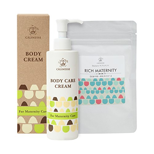 キャリネスボディクリームと腸内フローラを整えるサプリRICH MATERNITYのお得なセット。 10%OFFです。 妊娠中期~産後の方へおすすめです。 【キャリネスボディクリーム】 妊娠線予防クリームです。 妊娠線を予防する上で一番大切なのは保湿です。 ただし、お肌の表面を潤すだけでは妊娠線を予防することは出来ません。 妊娠線はお肌の奥の細胞が裂けることから出来てしまうので、 お肌の奥までケアをすることが大切です。 キャリネスボディクリームは、保湿力が高く、肌の奥まで浸透しハリや弾力を 与える成分を中心にバランスよく配合した美容皮膚科医監修のクリームです。 産後の体系戻しもサポートするクリームです。 また、ベビーのお肌の乾燥にも使用できるので、ママとベビー一緒に使えます。 朝塗れば夜まで続く保湿力。 1日2回朝と晩にご使用ください。 ポンプ式で使いやすく、伸びもよいので大変塗りやすくなっております。 マッサージの必要もありません。塗るだけでOK。 無香料なので悪阻の方でも安心してお使いいただけます。 着色剤、無鉱物油、アルコールフリーの低刺激処方。 【RICH MATERNITY】 妊娠13週目~授乳中までに必要な栄養素が配合されている腸内フローラを整えるサプリです。 妊娠中と産後のママの体と心を支え、ベビーが健康に育つためのママの体の環境をつくる 目的で設計した産婦人科医監修のサプリメントです。 妊婦さんやお腹のベビーにとって必要な栄養素は妊娠周期により変わります。 キャリネスでは必要な時期に必要な栄養素のみをしっかりと摂取できるよう シンプルにし、2種類のサプリメントを作りましたしました。 RICH MATERNITYにはビフィズス菌・カルシウム・マグネシウム・へム鉄・ビタミンDを 中心に配合しています。 妊娠中期からはベビーの健康な体を作るための栄養補給とママの健康な体を作る ことが大切です。 お腹の中にいる時のベビーは無菌状態です。 出産時ママの産道や医療従事者から菌をもらい腸内フローラが作られます。 ベビーはママからビフィズス菌をもらうので、ママと一緒のビフィズス菌を持ちます。 良い腸内フローラでいることは善玉菌であるビフィズス菌がとっても大切。 腸内フローラが良いと、免疫力が高まりアレルギー予防にもなります。 ベビーの健康のためにも、ママが良い腸内フローラでいることが大切。 RICH MATERNITYは胃酸や酵素に強く生きて大腸に届くビフィズス菌を25億個配合。 また、妊娠中期から後期にかけてはベビーの体が急激に 大きくなる時期です。 お腹の中でベビーが健康な体を作るために必要な栄養素は、 カルシウム・マグネシウム・亜鉛・葉酸 ママが健康でいる為に必要な栄養素は、 カルシウム・マグネシウム・ヘム鉄・ビタミンD・亜鉛 母乳育児に必要なのが栄養素は、 くる病予防にビタミンD 特に母乳育児をしているママにおすすめです。 1日4粒、朝食後と夕食後に2粒ずつお飲みいただくのがおすすめですが、 薬ではありませんので、決まった時間に飲まなくても大丈夫です。 飲むことがストレスにならないよう、飲める時にお飲みください。 ママが無理なく続けることが何よりも大切です。