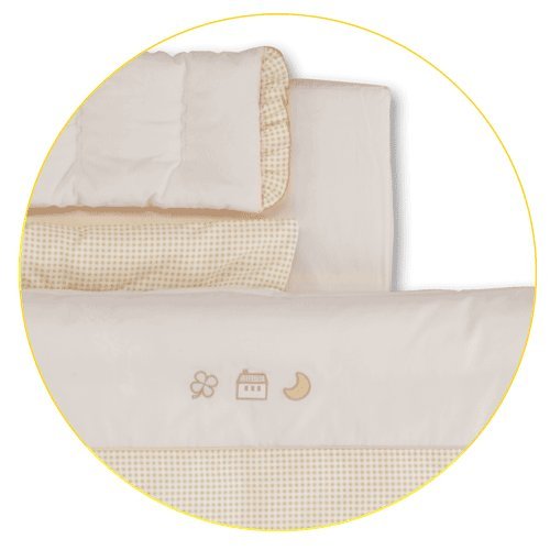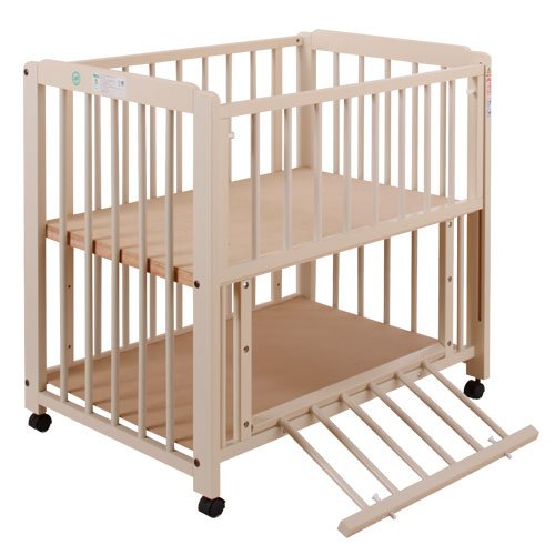 移動もラクラクのホワイトカラーのミニベッド! 収納棚がついているので育児用品などの収納に大変便利です。 かわいい茶と白のチェック柄のミニふとんがセットで付いています! ■ ミニふとんセット内容 ■ 生地:綿100%、中綿:ポリエステル100% ・掛けふとんカバーリング/83cm×108cm(日本製) ※掛けカバーは掛けふとんに掛けられた状態になります。 ・掛ふとんヌード/80cm×105cm(ウォシュロン)(日本製) ・肌ふとん/70cm×90cm(ウォシュロン)(日本製) ・枕/33cm×19cm(ウォシュロン)(日本製) ・敷フットシーツ/60cm×90cm(中国製) ・敷ふとん/60cm×90cm(固綿){※側生地(中国製)・中綿(日本製)}
