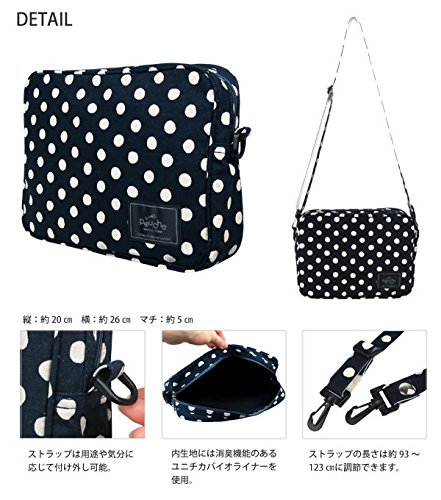 【日本製】 長崎の工房でひとつひとつ丁寧に作っています。 内生地に消臭効果抜群のユニチカバイオライナーを使用。 使用済オムツ、旅行時の下着や靴下、お弁当など 臭いが気になるものの収納に大活躍! 【消臭デオドラント加工】 ユニチカ開発の抗菌・防臭・消臭効果のある生地を使用しています。 糸の段階でセラミックス系の抗菌剤を練りこんでおり 摩擦にも強く抗菌剤がはがれる心配はありません。 すでに発生している悪臭ののみと科学的に反応し、臭いを元から除去します。 ■サイズ ・本体/26×20×5cm(W×H×D) ・ショルダーベルト/93~123cmに調整可 ■素材 ・外生地:綿100% ・内生地:バイオライナー(消臭効果)