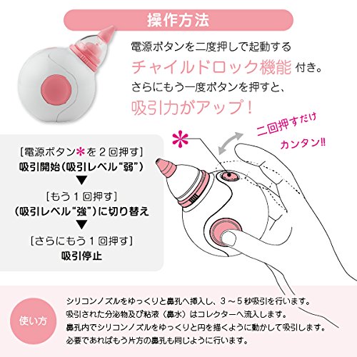 ・動作環境:+16~+35℃、≦85%RH(結露のないこと)・対象年齢:0歳~ - ボタン一つで赤ちゃんの鼻水を簡単に吸引! 吸引力は鼻水の状態に合わせて2段階で調節可能