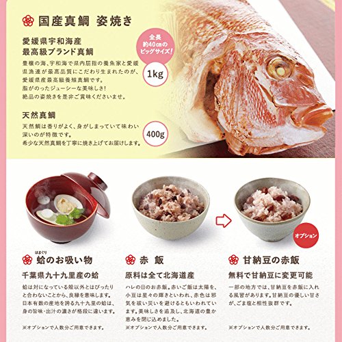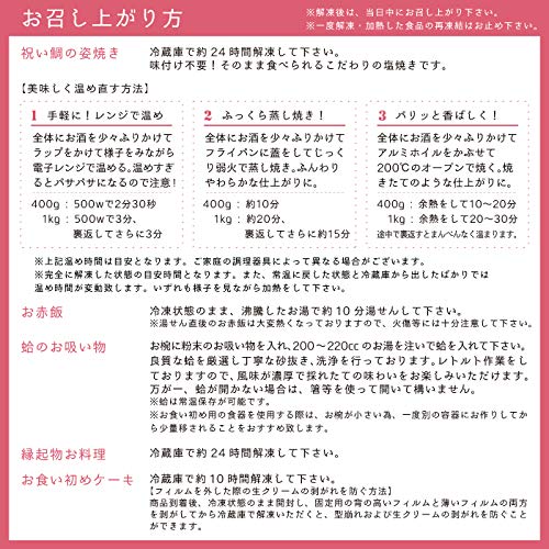 - ●祝い鯛姿焼き(焼き加工前 約400g)×1、●縁起物お料理5品(①海老塩茹で、②チーズ伊達巻、③海老とアスパラのテリーヌ、④紅白むすび餅、⑤手まり餅)