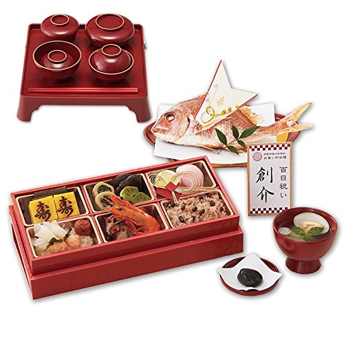 - ●お食い初め重6マス(①牛蒡田舎煮15g、②寿伊達焼2個、③青菜羽二重巻2個、④三本松2個、⑤椎茸旨煮2切、⑥紅白はまぐり新丈各1個、⑦紅白なます30g、⑧花巾着2個、⑨梅干し1個、⑩たこ旨煮2切、⑪ボイル海老2尾)、