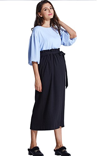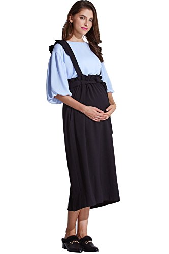 Sweet Mommy マタニティボトム ロングスカート フリルサスペンダー付き ウエスト調節機能 2WAY 肩ひも長さ調節可 ウエストリボン 大きいサイズ 裏地付き 上品素材 マキシ 産前産後 マタニティ/ブラック/F