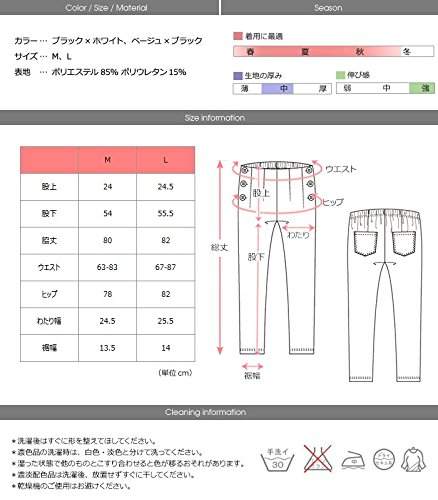 - サイズ(cm):M(股上24,股下54,脇丈80,ウエスト63-83,ヒップ78,渡り幅24.5,裾幅13.5), L(24.5,55.5,82,67-87,82,25.5,14)