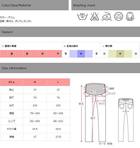 - サイズ(cm): M(股上37,股下74,総丈100,腹囲78-104,ヒップ82-106,わたり幅25.5,裾幅17), L(37,74,100,82-108,86-110,26.5,17.5)