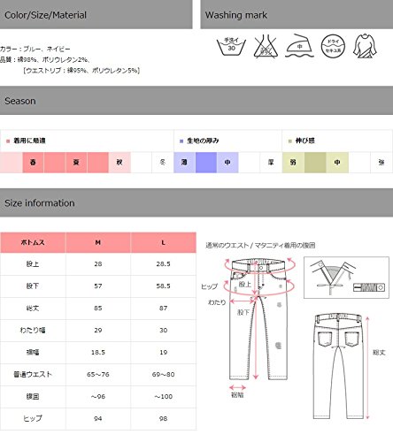 - サイズ(cm): M(股上28,股下57,総丈85,わたり幅29,裾幅18.5,普通ウエスト65-76,腹囲-96,ヒップ94), L(28.5,58.5,87,30,19,69-80,-100,98)
