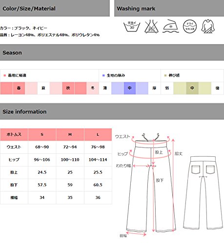 - サイズ(cm): S(ウエスト68-90,ヒップ96-106,股上24.5,股下57.5,裾幅34), M(72-94,100-110,25,59,35),L(76-98,104-114,25.5,60.5,36)