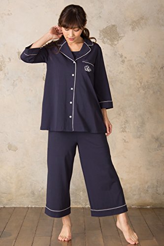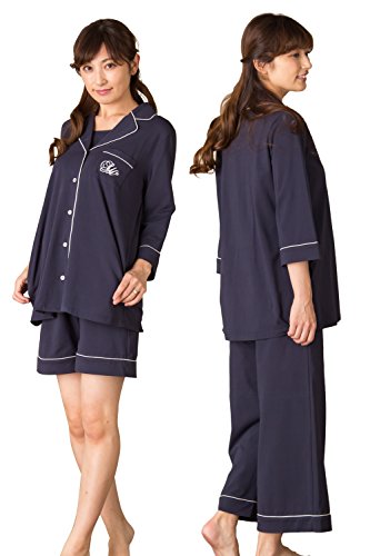 Sweet Mommy 【4点セット】 上質コットン ライン配色ナイティ 9分丈パンツ ショートパンツ 授乳レイヤー 前開き パジャマ 長袖 春 夏 産前産後 入院 出産準備 マタニティ 授乳服/M/ネイビー