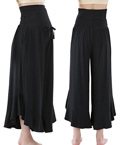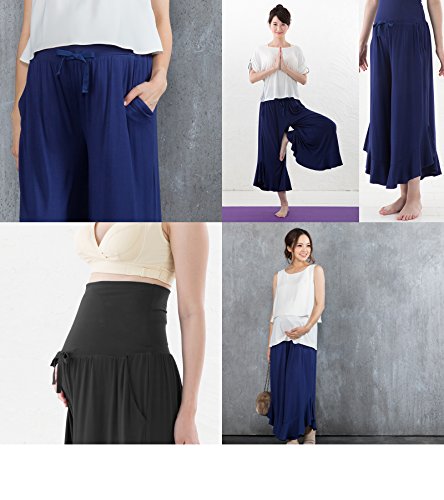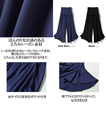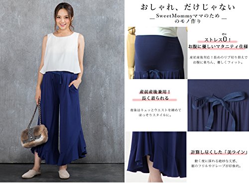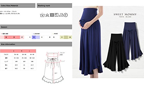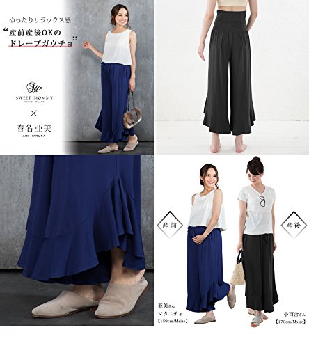 Sweet Mommy 裾フリル とろみガウチョ 長めウエストリブ ポケットつき スリット ルームウェア リラックス 冷え防止 ズボン ヨガ 春 夏 産前産後 マタニティ/ブラック/S