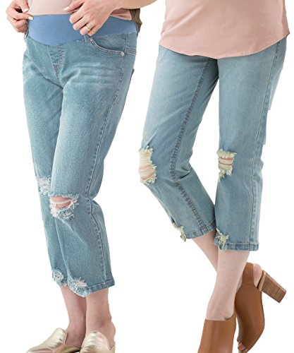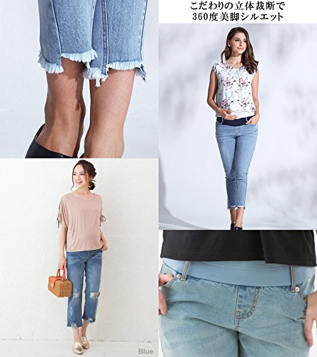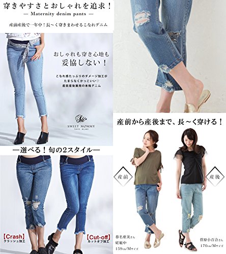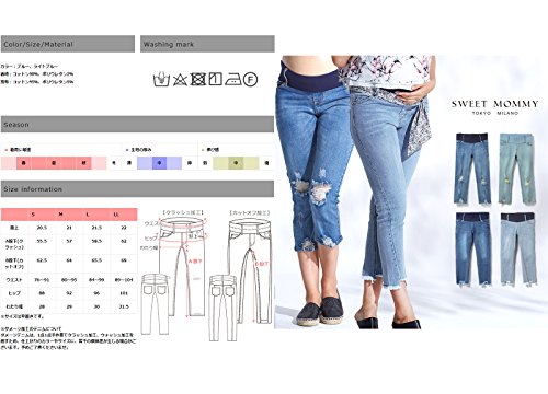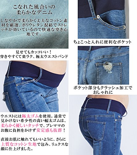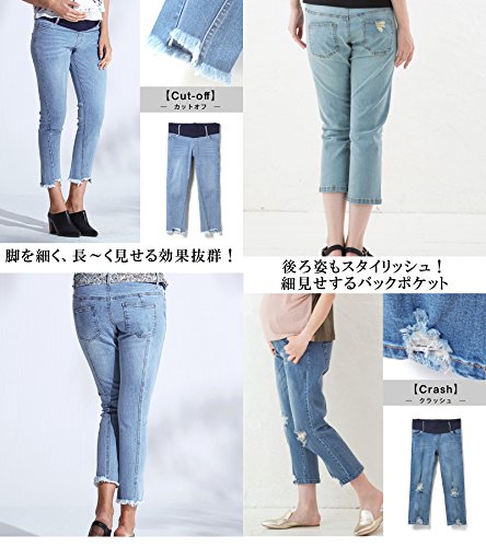 Sweet Mommy マタニティパンツ デニム ダメージタイプ選べる ローライズ ボトム 大きいサイズ 小さいサイズ 極太ウエストバンドでお腹支える コットン ポケットつき ズボン 産前産後/ライトブルー【クラッシュ】/LL