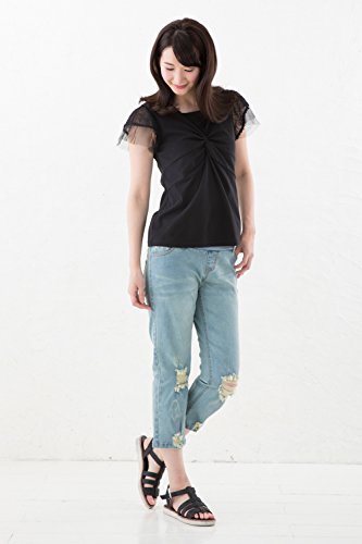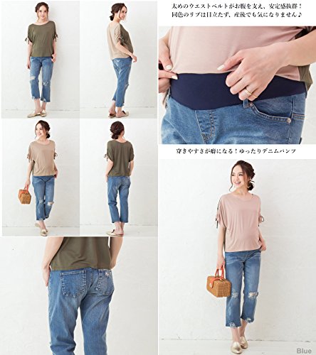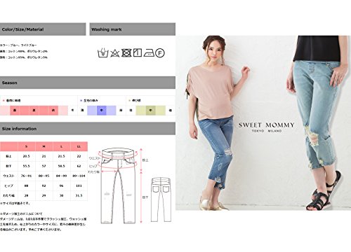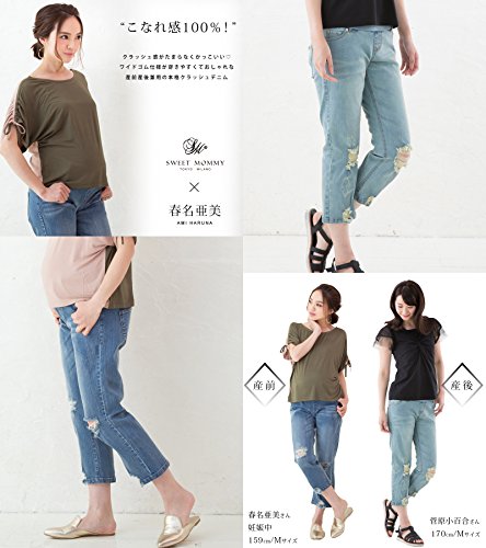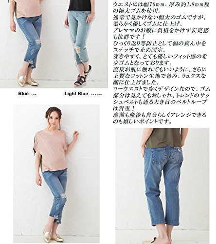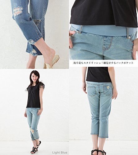 Sweet Mommy ローライズ ダメージデニム ウエストリブ 小さいサイズ 大きいサイズ 幅太ゴムでしっかり支える 春 夏 秋 ズボン 産前産後 マタニティ/ライトブルー【クラッシュ】/M