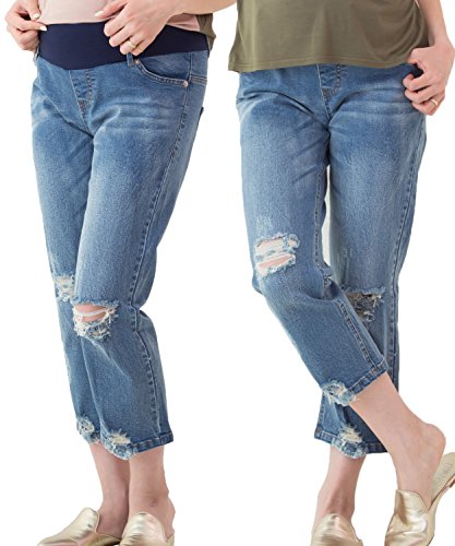 Sweet Mommy マタニティパンツ デニム ダメージタイプ選べる ローライズ ボトム 大きいサイズ 小さいサイズ 極太ウエストバンドでお腹支える コットン ポケットつき ズボン 産前産後/ブルー【クラッシュ】/L