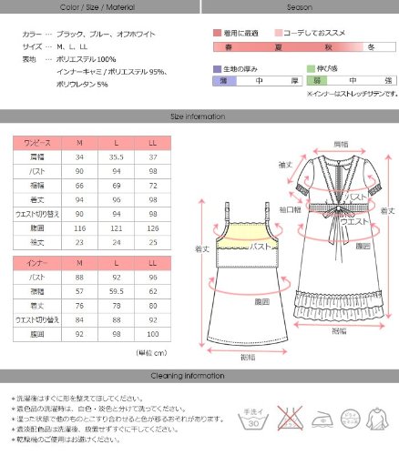 M(バスト88,裾幅57,着丈76,ウエスト切り替え84,腹囲92), L(92,59.5,78,88,98), LL(96,62,80,92,100)