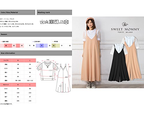 - トップスサイズ(cm): M(肩幅38,バスト98,着丈54,袖丈26,腹囲98-108), L(39,102,56,27,102-112) サロペットサイズ(cm): M(バスト94,着丈120,股下46,腹囲106), L(98,122,47,110)