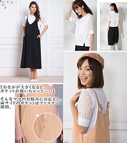 Sweet Mommy マタニティボトム 授乳トップス 上下2点セット サロペット 授乳服 ファスナー付きポケット ツイルジョーゼット キレイめ Tシャツ マタニティパンツ 大きいサイズ 産前産後/ブラック/L