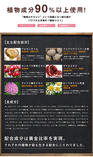 主な配合成分:アルガンオイル、プエラリアミリフィカ根、カニナバラ果実エキス、ザクロエキス、ライマメ種子エキス、ローマカミツレ花油