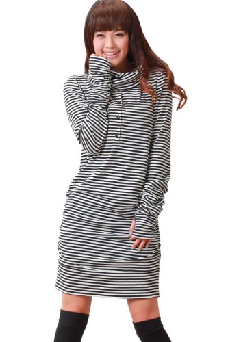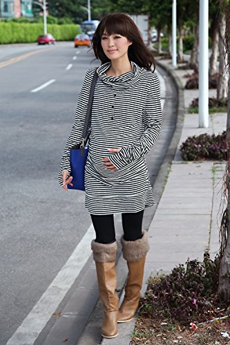 Sweet Mommy マタニティ 授乳服 ワンピース チュニック 授乳レイヤー付き オフタートル サイドギャザー ストレッチコットン 指穴付き 着痩せ 大きいサイズ 秋 冬 産前産後 【ベラ】/L/ブラック×ホワイト