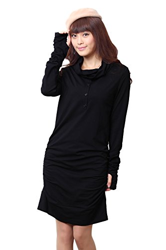 Sweet Mommy マタニティ 授乳服 ワンピース チュニック 授乳レイヤー付き オフタートル サイドギャザー ストレッチコットン 指穴付き 着痩せ 大きいサイズ 秋 冬 産前産後 【ベラ】/L/ブラック