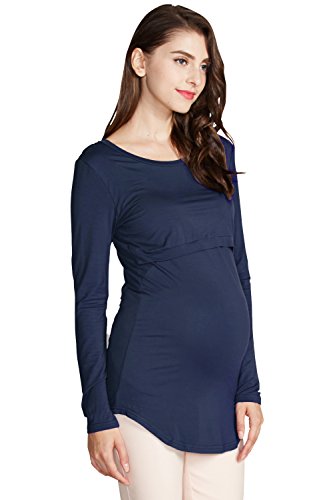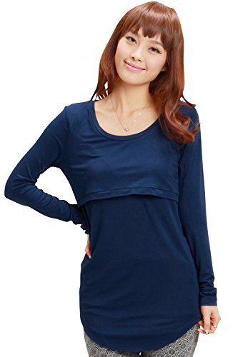 Sweet Mommy 竹繊維 ラウンドネック 伸縮 フィット シンプル 授乳 ロング丈 Tシャツ 天然素材 長袖/M/ネイビー