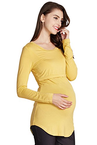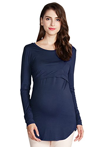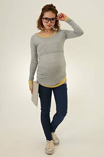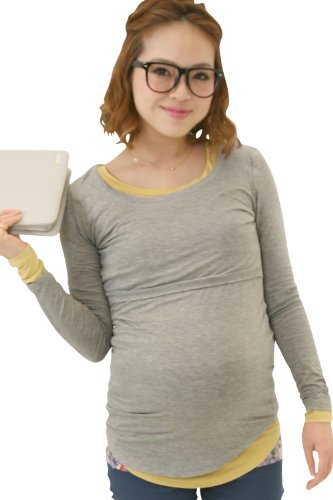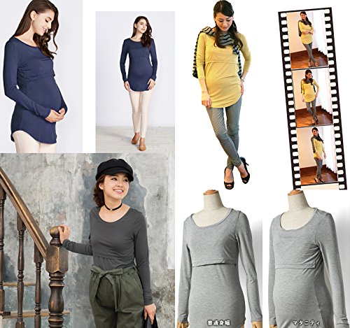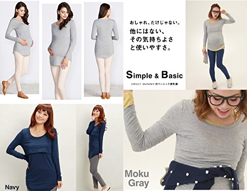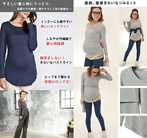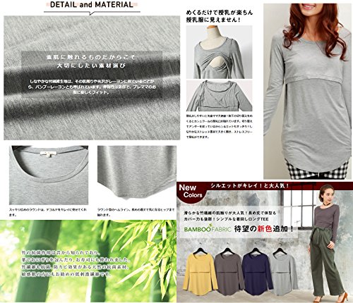 Sweet Mommy 竹繊維 ラウンドネック 伸縮 フィット シンプル 授乳 ロング丈 Tシャツ 天然素材 長袖/L/杢グレー