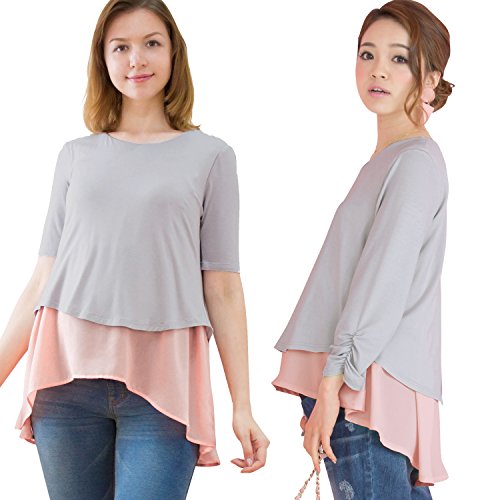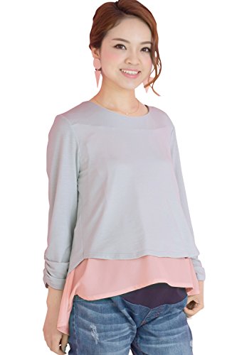 Sweet Mommy マタニティトップス 授乳服 授乳ケープ 袖丈選べる 授乳口付き Tシャツ 授乳トップス 異素材MIX 重ね着風 バックスリット 大きいサイズ ジョーゼット×シフォン ドッキング レイヤード プルオーバー オフィス 春 夏 秋 産前産後 マタニティ F グレー×ピンク
