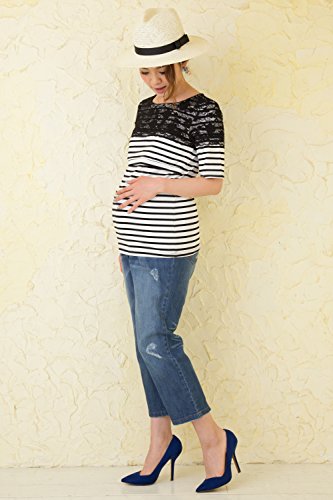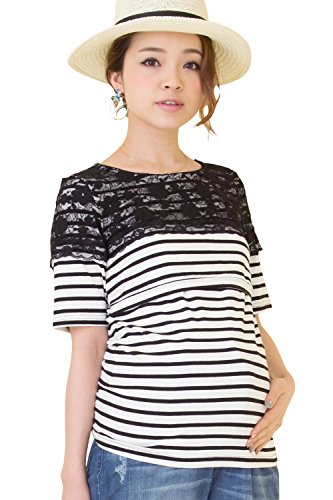 Sweet Mommy マタニティトップス 授乳服 授乳口付き Tシャツ ストレッチレース×ボーダー やわらかコットン 大きいサイズ カジュアル 春 夏 半袖 産前産後 M ホワイト×ブラック