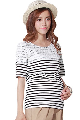 Sweet Mommy マタニティトップス 授乳服 授乳口付き Tシャツ ストレッチレース×ボーダー やわらかコットン 大きいサイズ カジュアル 春 夏 半袖 産前産後 M ホワイト