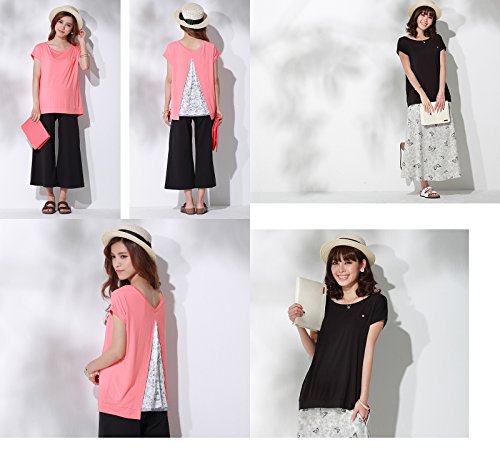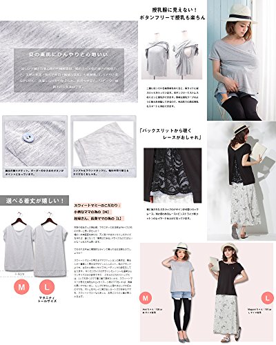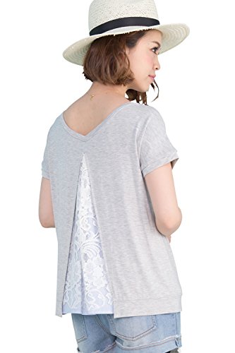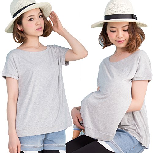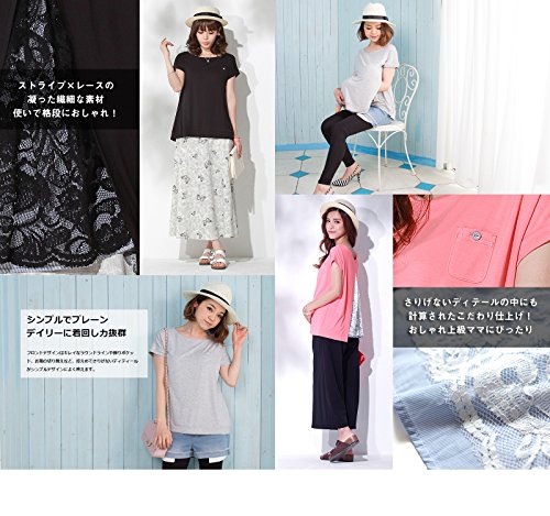 Sweet Mommy マタニティ 授乳服 トップス とろみ竹繊維 授乳ケープにもなる 授乳口付き Tシャツ バックスリットトップス レース×コットンストライプレイヤード 選べる着丈 春 夏 半袖 産前産後 天然素材 M 杢グレー