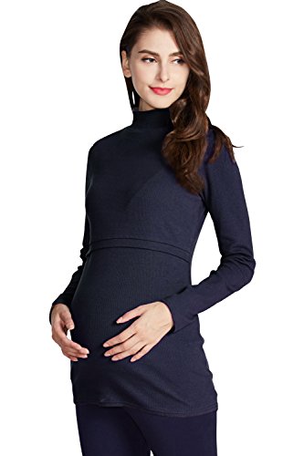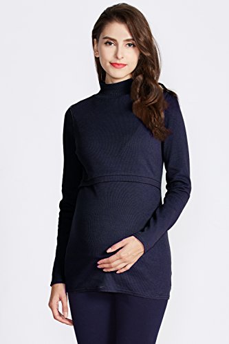 Sweet Mommy 柔らかコットン リブ素材 ボトルネック 軽フィット ハイネック ロング丈 シンプル 授乳 トップス カットソー 授乳服 マタニティ/ M ネイビー