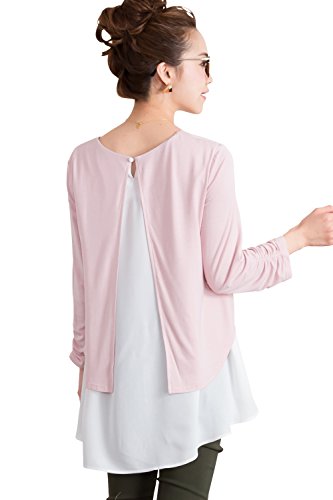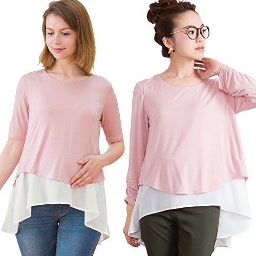 Sweet Mommy マタニティトップス 授乳服 授乳ケープ 袖丈選べる 授乳口付き Tシャツ 授乳トップス 異素材MIX 重ね着風 バックスリット 大きいサイズ ジョーゼット×シフォン ドッキング レイヤード プルオーバー オフィス 春 夏 秋 産前産後 マタニティ F ピンク×ホワイト