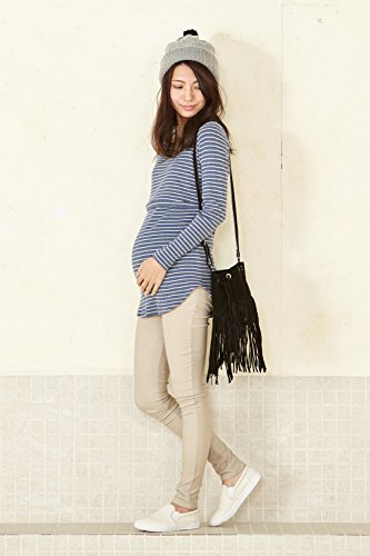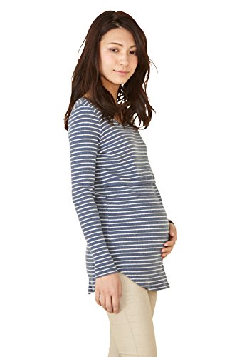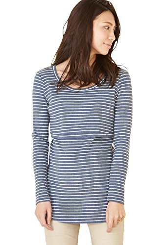 Sweet Mommy 柔らかコットン リブ素材 軽フィット すっきりデコルテ ロング丈 シンプル 授乳 トップス カットソー 授乳服 マタニティ L ネイビーボーダー