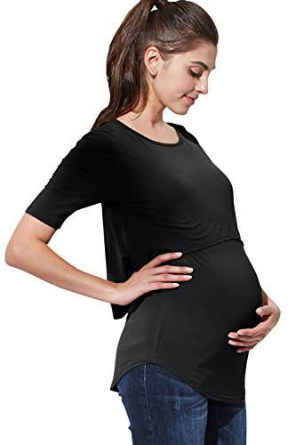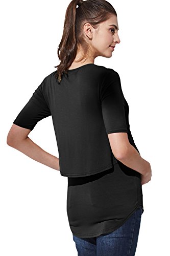 Sweet Mommy なめらか竹繊維 レイヤード 授乳トップス Tシャツ 5分丈 長め丈 バックロング シンプル 授乳服 マタニティ 産前産後 S ブラック