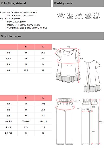 - パンツサイズ(cm): M(総丈99,股上29,股下70,ウエスト72-106,ヒップ113,わたり幅31),L(101,29.5,71.5,76-110,117,32)