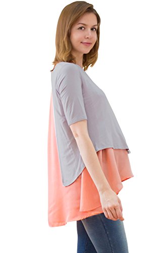 Sweet Mommy マタニティトップス 授乳服 授乳ケープ 袖丈選べる 授乳口付き Tシャツ 授乳トップス 異素材MIX 重ね着風 バックスリット 大きいサイズ ジョーゼット×シフォン ドッキング レイヤード プルオーバー オフィス 春 夏 秋 産前産後 マタニティ/半袖・F/グレー