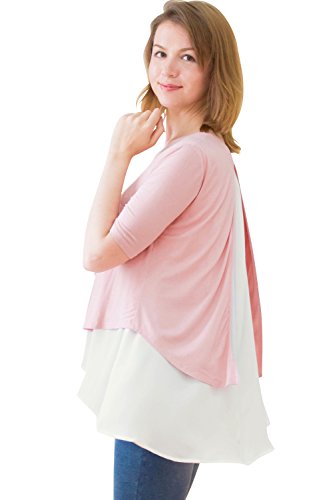 Sweet Mommy マタニティトップス 授乳服 授乳ケープ 袖丈選べる 授乳口付き Tシャツ 授乳トップス 異素材MIX 重ね着風 バックスリット 大きいサイズ ジョーゼット×シフォン ドッキング レイヤード プルオーバー オフィス 春 夏 秋 産前産後 マタニティ/半袖・F/ピンク
