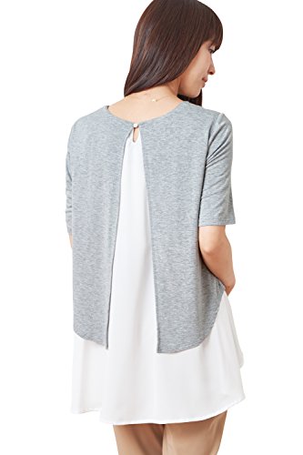 Sweet Mommy マタニティトップス 授乳服 授乳ケープ 袖丈選べる 授乳口付き Tシャツ 授乳トップス 異素材MIX 重ね着風 バックスリット 大きいサイズ ジョーゼット×シフォン ドッキング レイヤード プルオーバー オフィス 春 夏 秋 産前産後 マタニティ/半袖・F/杢グレー
