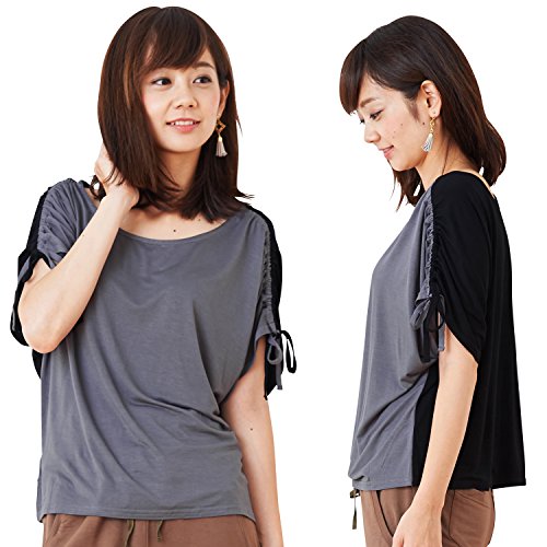 Sweet Mommy 前後リバーシブル ショルダーギャザー Tシャツ なめらかストレッチ素材 着る授乳ケープ バイカラー トップス 春 夏 半袖 産前産後 授乳服 マタニティ/F/ブラック×チャコール