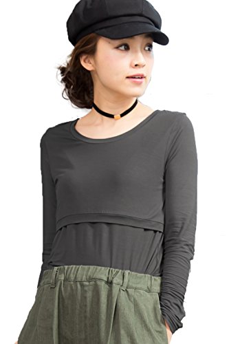 Sweet Mommy 竹繊維 ラウンドネック 伸縮 フィット シンプル 授乳 ロング丈 Tシャツ 天然素材 長袖/L/チャコール