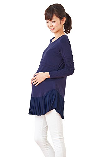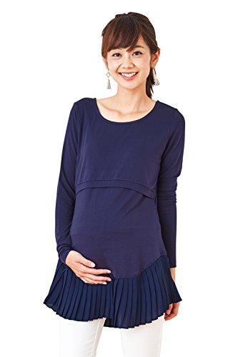 Sweet Mommy シフォン裾プリーツ 大人可愛い しっとりストレッチレーヨン 長袖トップス 着回し 授乳レイヤー シンプル シルエット マタニティ 授乳服/M/ネイビー