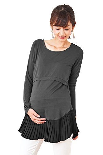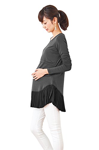 Sweet Mommy シフォン裾プリーツ 大人可愛い しっとりストレッチレーヨン 長袖トップス 着回し 授乳レイヤー シンプル シルエット マタニティ 授乳服/M/チャコール