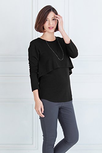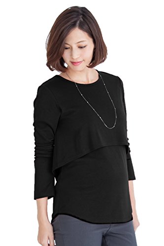 Sweet Mommy さらさら レイヤード 授乳Tシャツ 長め丈 バックロング シルエットきれい シンプル 長袖 着回し 授乳服 マタニティ 産前産後/M/ブラック