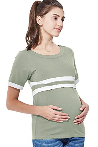 Sweet Mommy ストレッチコットン スリムフィット Wライン 授乳Tシャツ デコルテすっきり ラウンドネック 配色ライン 授乳トップス シンプル 産前産後 授乳服 マタニティ/LL/ライトカーキ