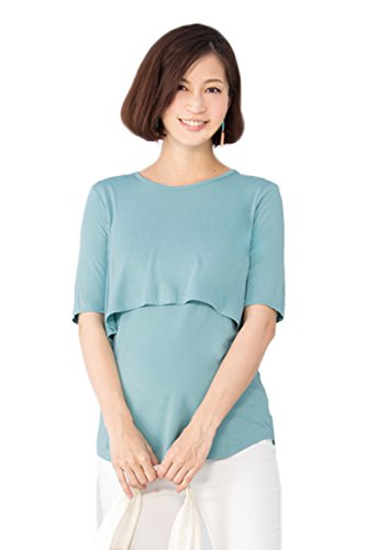 Sweet Mommy なめらか竹繊維 レイヤード 授乳トップス Tシャツ 5分丈 長め丈 バックロング シンプル 授乳服 マタニティ 産前産後/M/ブルー