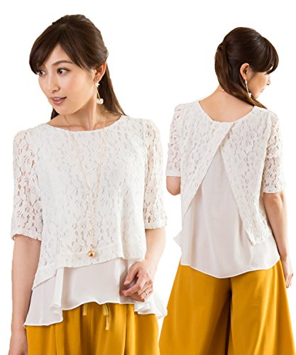 Sweet Mommy マタニティトップス 授乳服 シフォン×ストレッチレース バックスリット ホワイト 5分袖・L