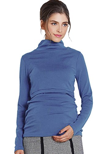 Sweet Mommy マタニティトップス 授乳服 授乳口付き タートルネック 上質裏起毛 あったか Tシャツ 大きいサイズ ハイネック ロング丈 ふんわり柔らか スリムフィット 無地はコットン 秋 冬 長袖 産前産後/S/ブルー