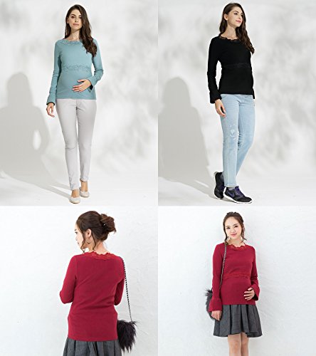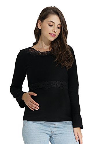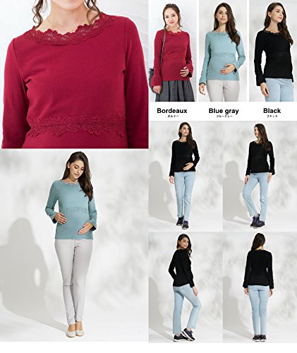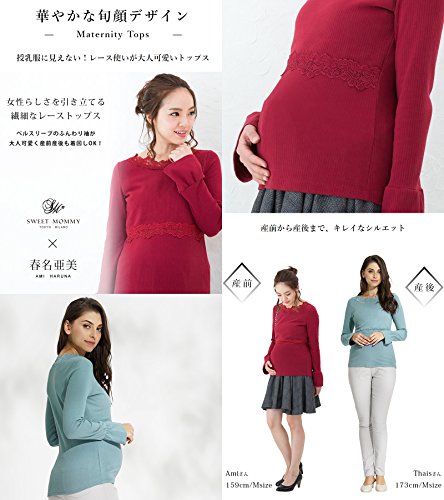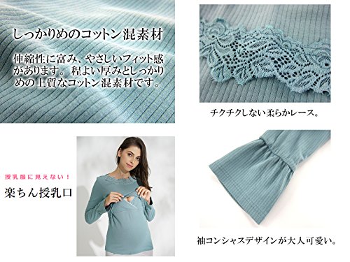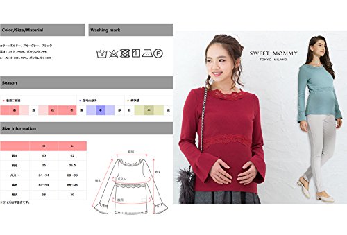 Sweet Mommy マタニティトップス 授乳服 レース ベルスリーブ 授乳口付き コットンリブ Tシャツ 大きいサイズ 春 秋 冬 長袖 産前産後/ブラック/L
