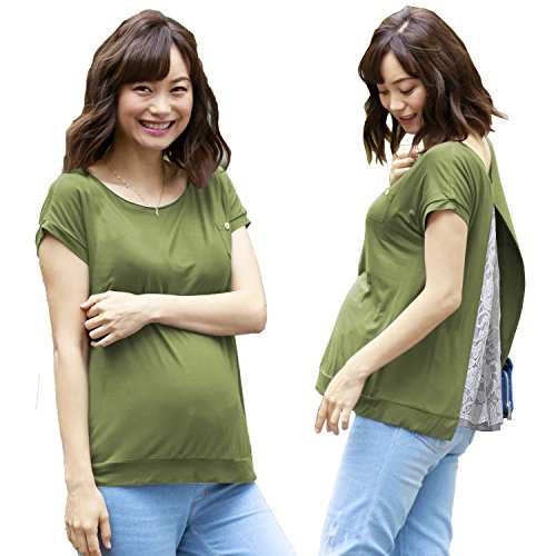 Sweet Mommy マタニティ 授乳服 トップス バックスリット レース×コットンストライプ L カーキ